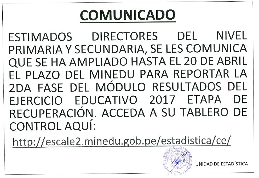 AMPLIACIÓN DE PLAZO PARA REPORTAR 2DA FASE DEL MODULO EJERCICIO EDUCATIVO 2017 - ETAPA DE RECUPERACIÓN Imagen Institucional 2018-04-13 14:59:15 Descripción: COMUNICADO 001-2018-ESTADISTICA-UGELTACNA Descargar documento