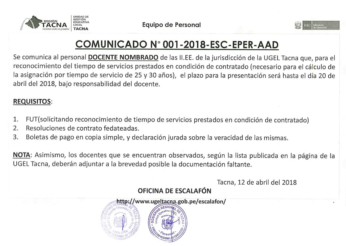 RECONOCIMIENTO DE TIEMPO DE SERVICIOS PRESTADOS EN CONDICION DE CONTRATADO (25 Y 30 AÑOS) Imagen Institucional 2018-04-12 15:59:03 Descripción: COMUNICADO 001-2018-ESCALAFON-UGELT Descargar documento
