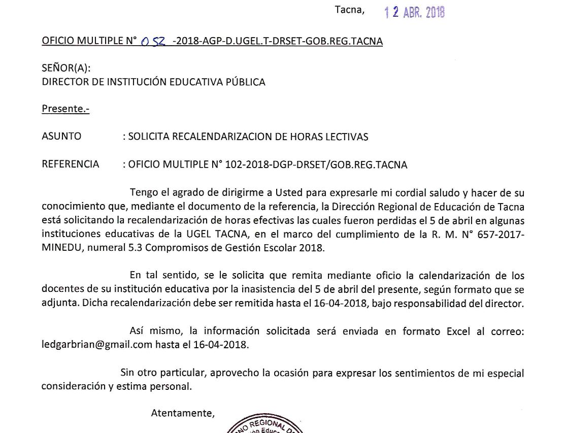 SOLICITA RECALENDARIZACION DE HORAS LECTIVAS Imagen Institucional 2018-04-12 20:34:34 Descripción: OFICIO MULTIPLE 052-2018-AGP-UGELT Descargar documento Descargar archivo