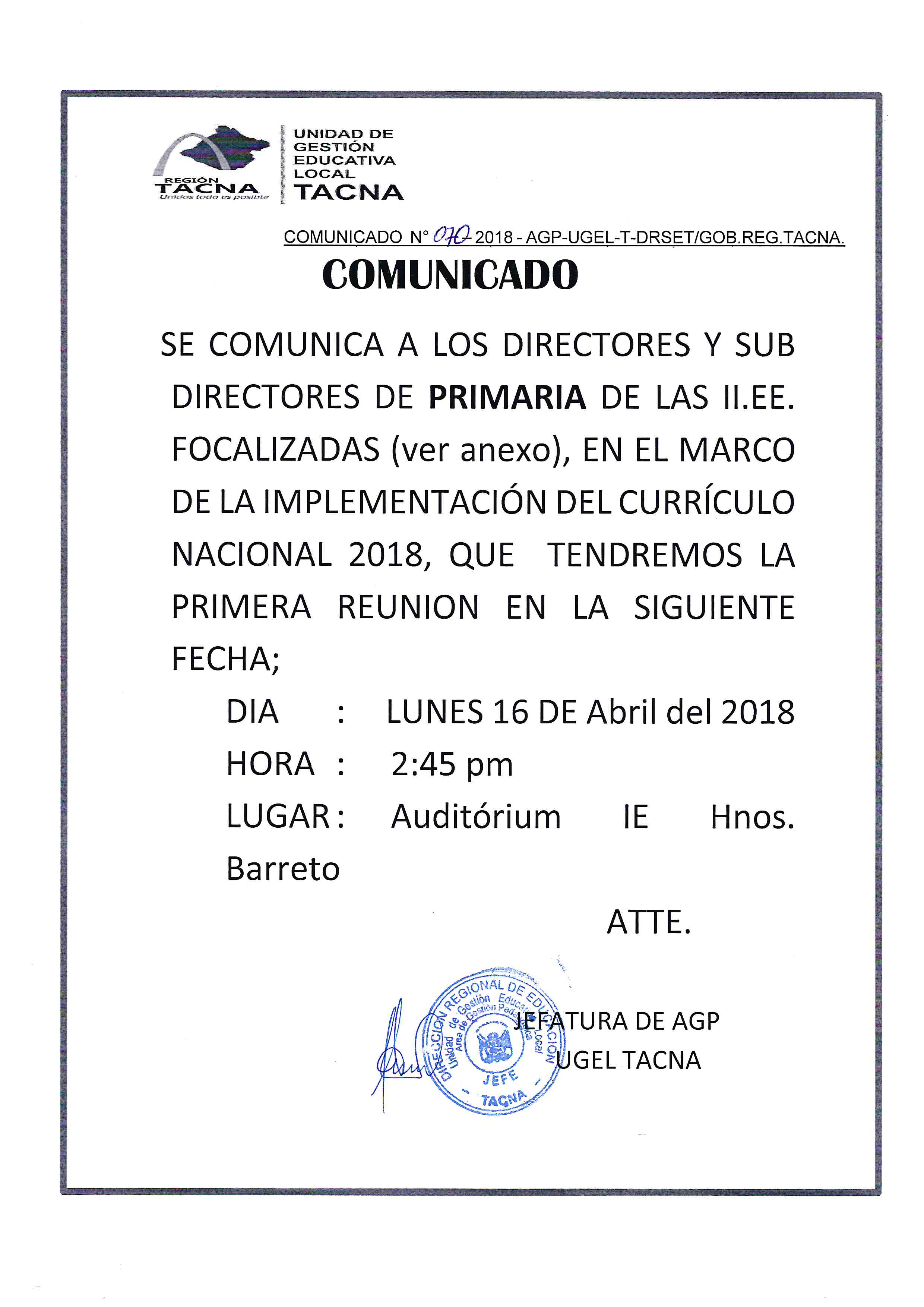 SE COMUNICA A LOS DIRECTORES Y SUBDIRECTORES DE PRIMARIA DE LAS II.EE. FOCALIZADAS (VER ANEXO) Imagen Institucional 2018-04-13 16:08:40 Descripción: COMUNICADO 070-2018-J-AGP-UGELT Descargar documento