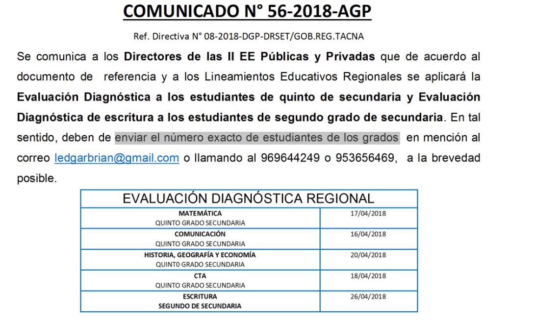 ENVIAR NÚMERO DE ESTUDIANTES DE QUINTO DE SECUNDARIA PARA EVALUACIÓN DIAGNÓSTICA REGIONAL Imagen Institucional 2018-04-04 14:03:10 Descripción: COMUNICADO 056-2018-AGP-UGELT Descargar documento