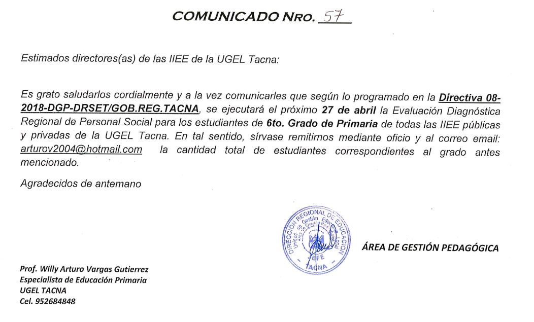 ENVIAR NÚMERO DE ESTUDIANTES DE SEXTO DE PRIMARIA PARA EVALUACIÓN DIAGNÓSTICA REGIONAL Imagen Institucional 2018-04-04 14:42:21 Descripción: COMUNICADO 057-2018-AGP-UGELT Descargar documento
