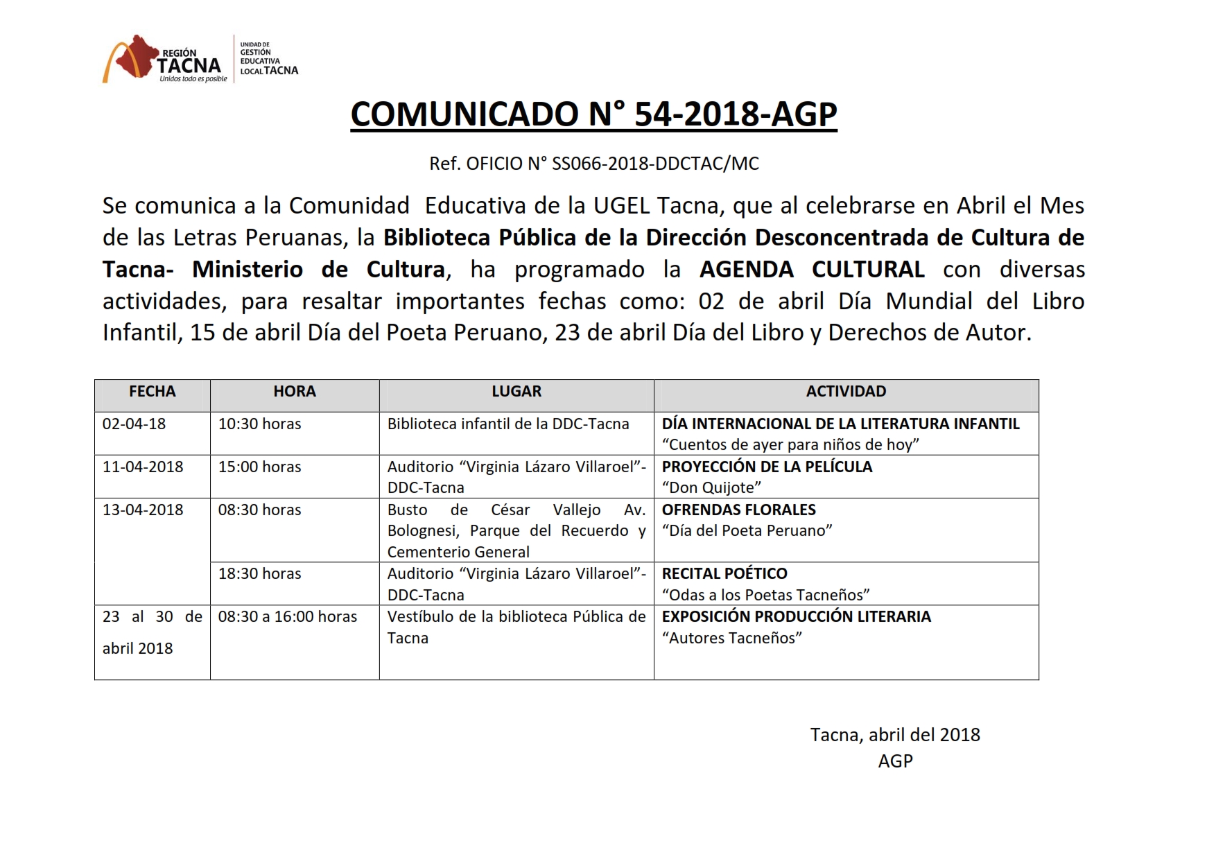 AGENDA CULTURAL DE LA BIBLIOTECA PÚBLICA DE TACNA (DIRECCIÓN DESCONCENTRADA DE CULTURA) Imagen Institucional 2018-04-03 10:38:18 Descripción: COMUNICADO 054-2018-AGP-UGELT Descargar documento