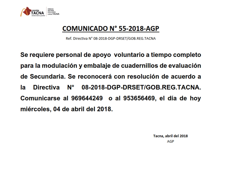 SE REQUIERE PERSONAL DE APOYO PARA LA MODULACIÓN Y EMBALAJE DE CUADERNILLOS DE EVALUACIÓN DE SECUNDARIA Imagen Institucional 2018-04-04 10:12:15 Descripción: COMUNICADO 055-2018-AGP-UGELT Descargar documento