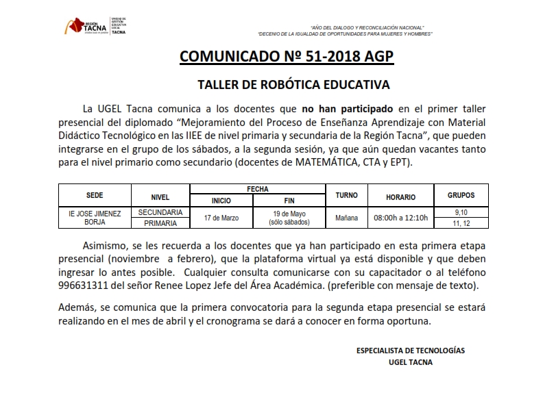 TALLER DE ROBOTICA EDUCATIVA Imagen Institucional 2018-03-23 08:05:03 Descripción: COMUNICADO 051-2018-AGP-UGELT Descargar documento