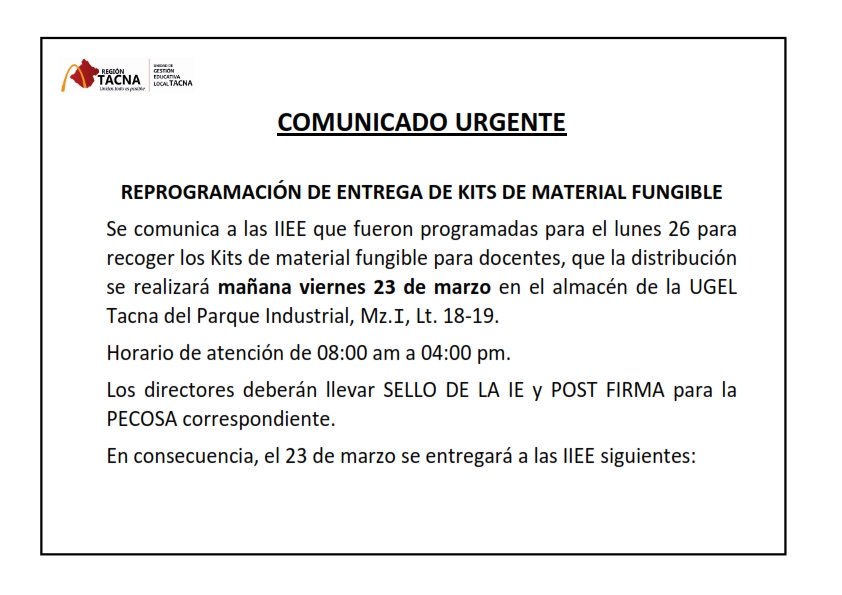 REPROGRAMACION. DISTRIBUCION DE KITS DE MATERIAL FUNGIBLE PARA DOCENTES Imagen Institucional 2018-03-23 07:59:58 Descripción: UGEL TACNA Descargar documento