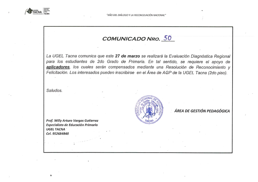 SE REQUIERE APLICADORES PARA EVALUACION DIAGNOSTICA REGIONAL PARA ESTUDIANTES DE 2DO DE PRIMARIA. Imagen Institucional 2018-03-23 08:04:25 Descripción: COMUNICADO 050-2018-AGP-UGELT Descargar documento