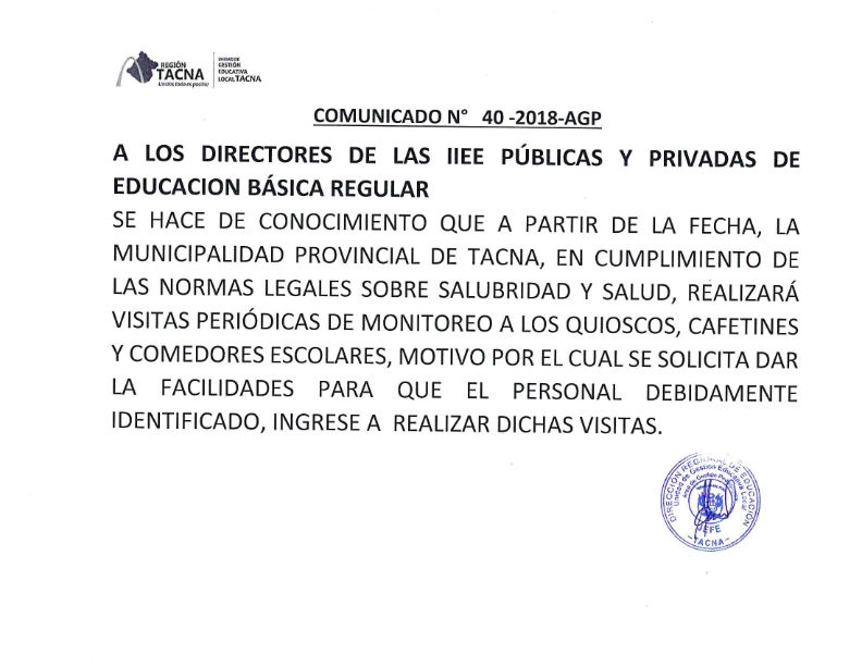 MUNICIPALIDAD PROVINCIAL REALIZARA VISITAS DE MONITOREO A QUIOSCOS, CAFETINES Y COMEDORES ESCOLARES Imagen Institucional 2018-03-23 07:27:44 Descripción: COMUNICADO 040-2018-AGP-UGELT Descargar documento