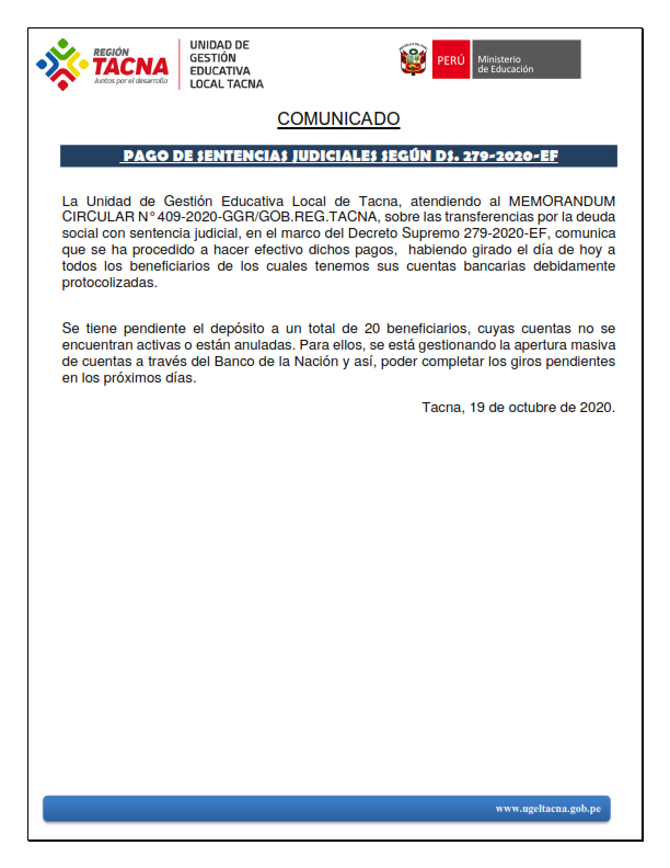 COMUNICADO - PAGO DE SENTENCIAS JUDICIALES SEGÚN DS. 279-2020-EF Imagen Institucional 2020-10-19 22:42:50 Descripción: PAGO DE SENTENCIAS JUDICIALES SEGÚN DS. 279-2020-EF Descargar documento