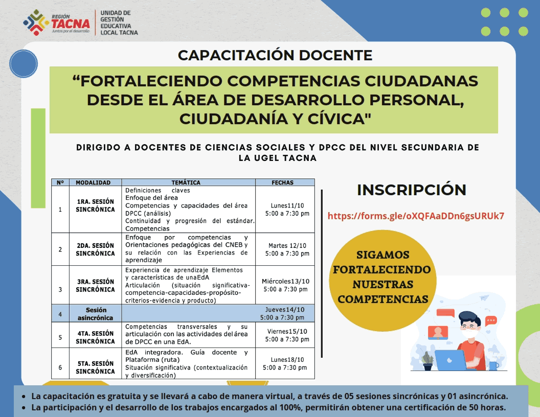 FORTALECIENDDO COMPETENCIAS CIUDADANAS DESDE EL ÁREA DE DESARROLLO PERSONAL, CIUDADANÍA Y CÍVICA Imagen Institucional 2021-10-05 15:59:12 Descripción: CAPACITACIÓN DOCENTE Link 1: https://forms.gle/oXQFAaDDn6gsURUk7