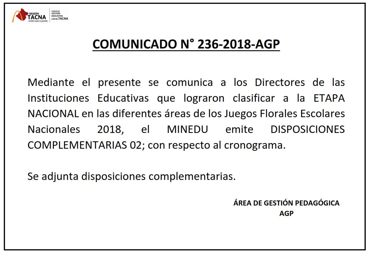 JUEGOS FLORALES ETAPA NACIONAL - DISPOSICIONES COMPLEMENTARIAS Imagen Institucional 2018-10-04 20:41:04 Descripción: COMUNICADO 233-2018-AGP-UGELT Descargar documento