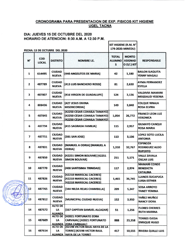 Descripción: Cronograma para presentación de Exp. Físicos Kit Higiene Ugel Tacna
