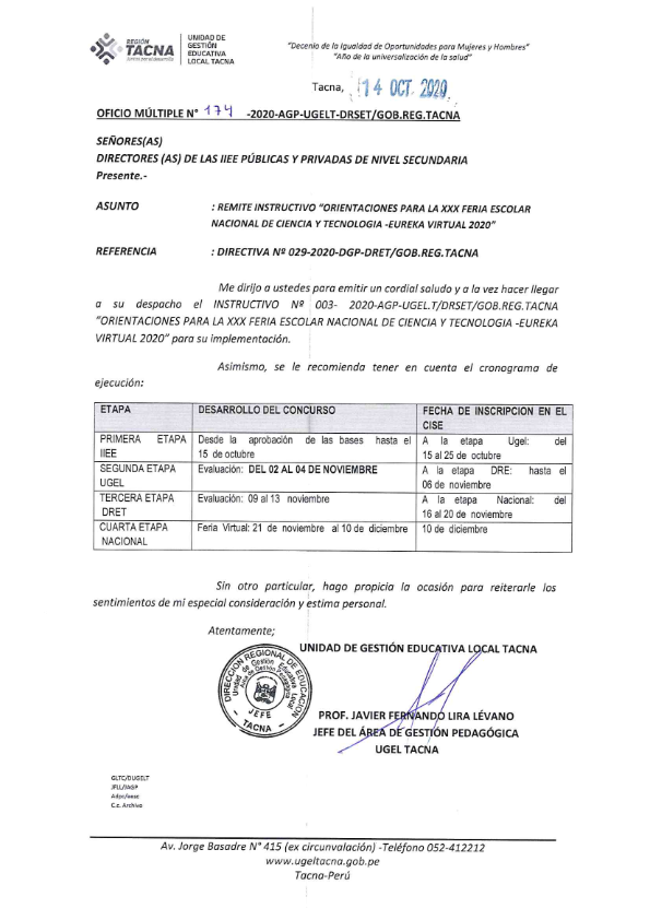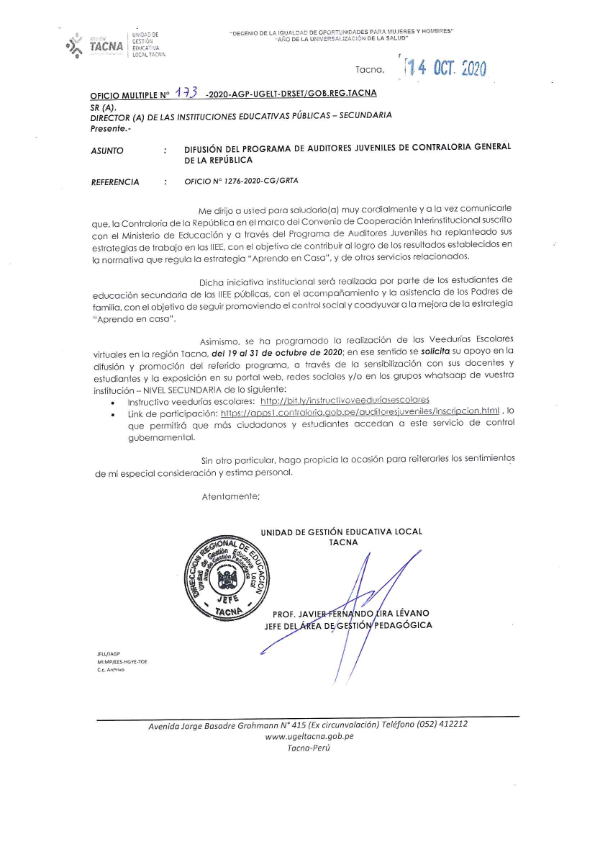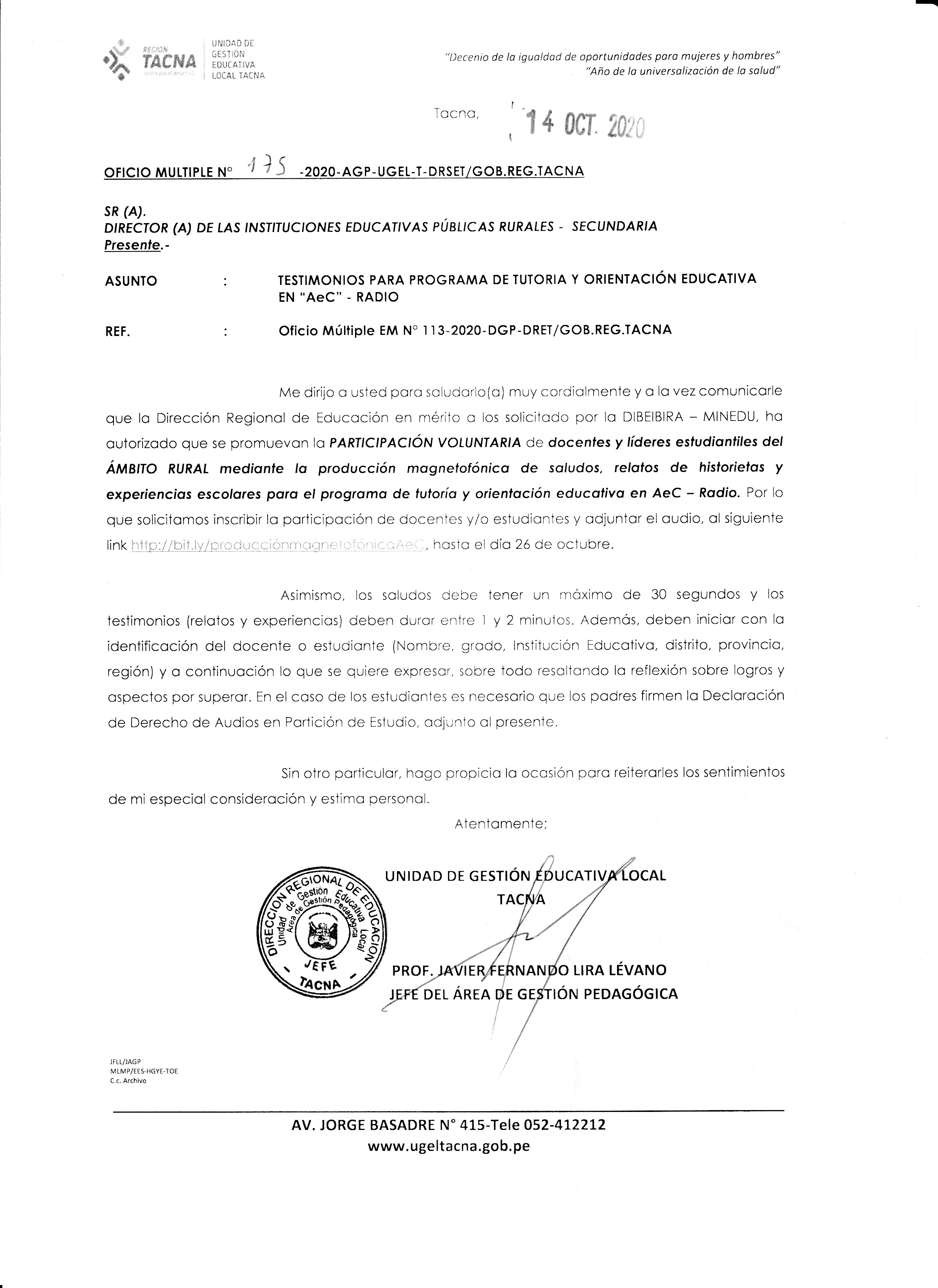 Descripción: Oficio múltiple N° 175-2020-AGP-UGEL.T-DRET/GOB.REG.TACNA