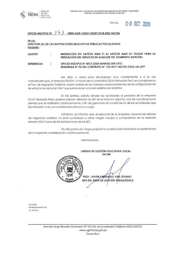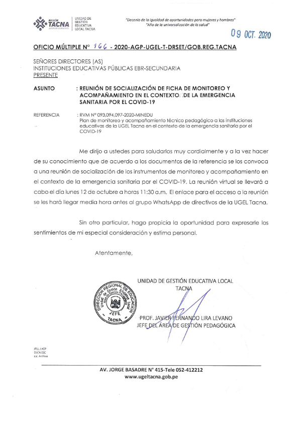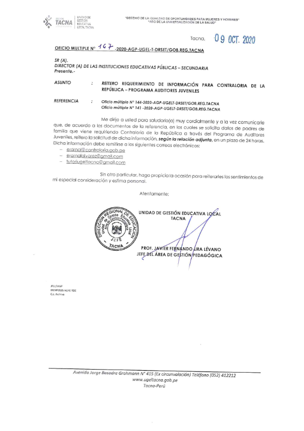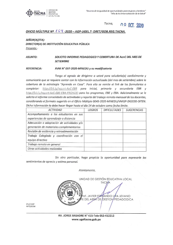 Descripción: Oficio múltiple N° 167-2020-AGP-UGEL.T-DRET/GOB.REG.TACNA