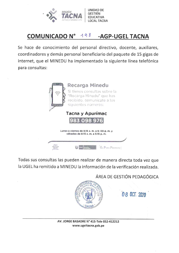 Descripción: Comunicado N° 198-AGP-UGELTACNA