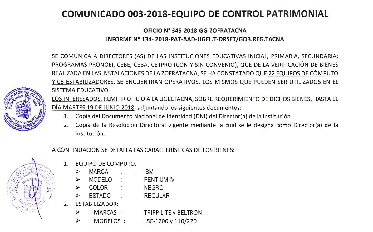 EQUIPOS DE CÓMPUTO A DISPONIBILIDAD PARA IIEE Imagen Institucional 2018-06-14 19:11:58 Descripción: COMUNICADO 003-2018-PATRIMONIO Descargar documento
