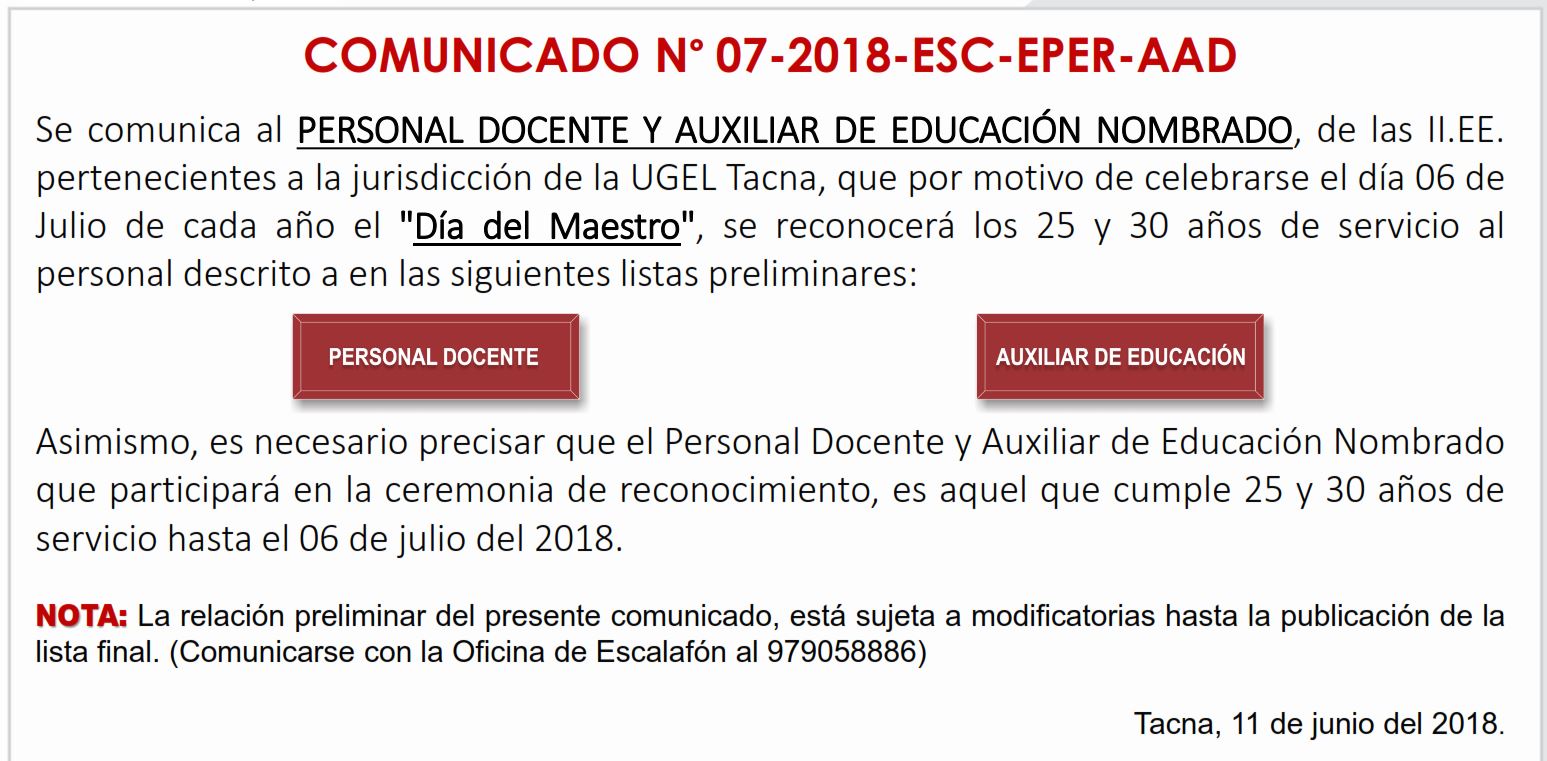 RELACION DE DOCENTES CON 25 Y 30 AÑOS DE SERVICIO QUE PARTICIPARAN EN LA CEREMONIA DE RECONOCIMIENTO POR EL DIA DEL MAESTRO 2018 Imagen Institucional 2018-06-12 18:03:17 Descripción: COMUNICADO 007-2018-ESCALAFON-UGELT Descargar documento