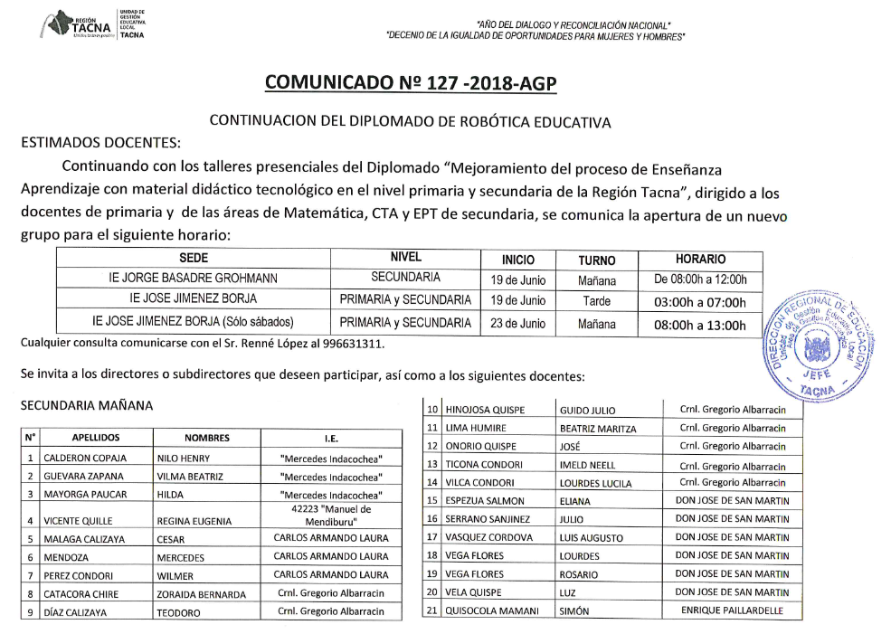 CONTINUACIÓN DEL DIPLOMADO DE ROBÓTICA EDUCATIVA Imagen Institucional 2018-06-15 15:30:16 Descripción: COMUNICADO 127-2018-AGP-UGELT Descargar documento