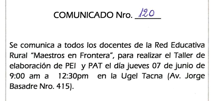TALLER DE ELABORACION DE PEI Y PAT PARA RED EDUCATIVA RURAL "MAESTROS EN FRONTERA" Imagen Institucional 2018-06-06 17:36:27 Descripción: COMUNICADO 120-2018-AGP-UGELT Descargar documento