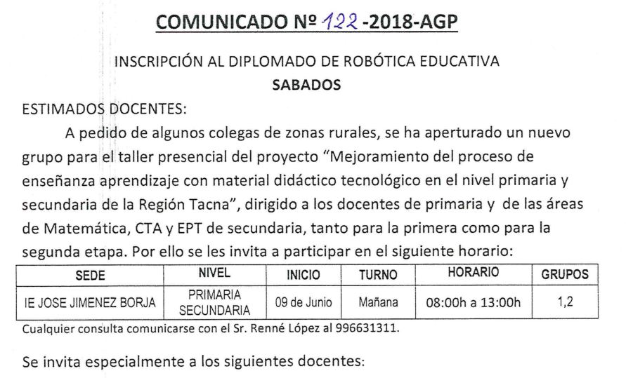 DIPLOMADO DE ROBÓTICA EDUCATIVA (SÁBADOS) Imagen Institucional 2018-06-08 08:21:01 Descripción: COMUNICADO 122-2018-AGP-UGELT Descargar documento
