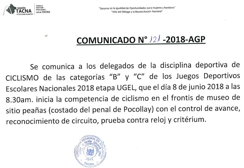 SE COMUNICA A LOS DELGADOS DE LA DISCIPLINA DEPORTIVA DE CICLISMO CATEGORÍA B Y C DE LOS JUEGOS DEPORTIVOS ESCOLARES NACIONALES 2018 ETAPA UGEL Imagen Institucional 2018-06-07 11:46:16 Descripción: COMUNICADO 121-2018-AGP-UGELT Descargar documento