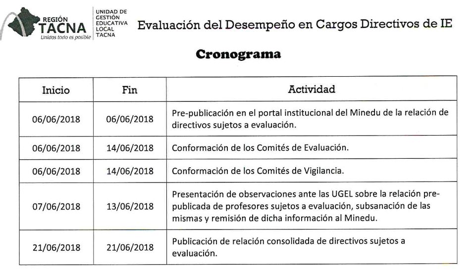 CRONOGRAMA DE EVALUACION DEL DESEMPEÑO EN CARGOS DIRECTIVOS DE IE Imagen Institucional 2018-06-06 17:41:25 Descripción: UGEL TACNA - DRSET - MINEDU Descargar documento