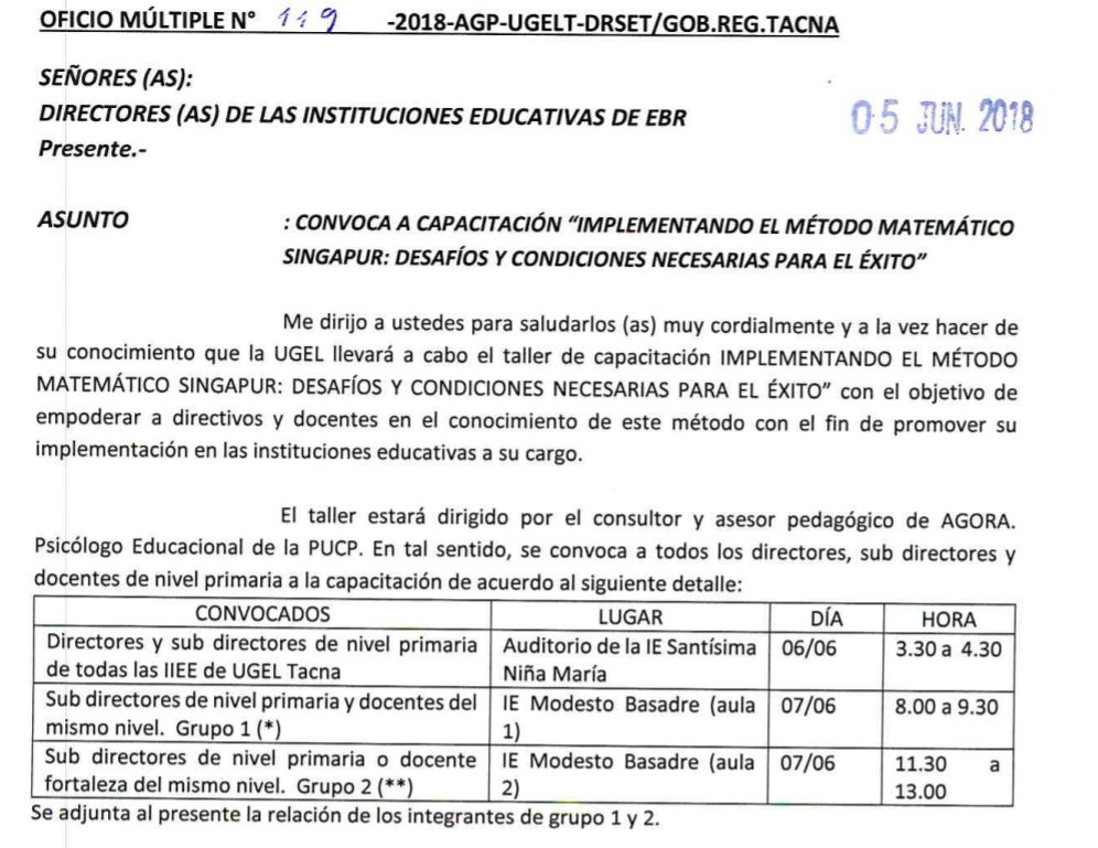 CAPACITACIÓN "IMPLEMENTANDO EL MÉTODO MATEMÁTICO SINGAPUR: DESAFIOS Y CONDICIONES NECESARIAS PARA EL EXITO" Imagen Institucional 2018-06-05 18:08:51 Descripción: OF_MULT_119-2018-AGP-UGELT Descargar documento