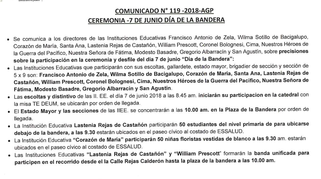 CEREMONIA: 7 DE JUNIO - DÍA DE LA BANDERA Imagen Institucional 2018-06-06 08:45:13 Descripción: COMUNICADO 119-2018-AGP-UGELT Descargar documento