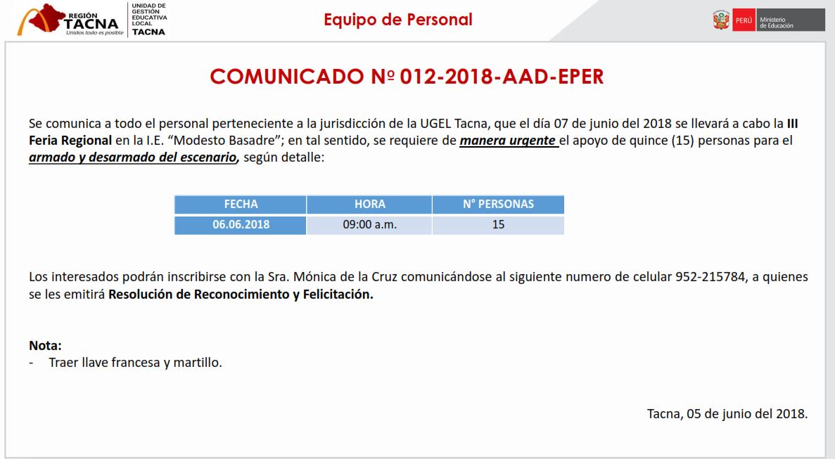 PERSONAL DE APOYO PARA ARMADO Y DESARMADO DE ESCENARIO Imagen Institucional 2018-06-05 19:13:33 Descripción: COMUNICADO 012-2018-EPER-UGELTACNA Descargar documento