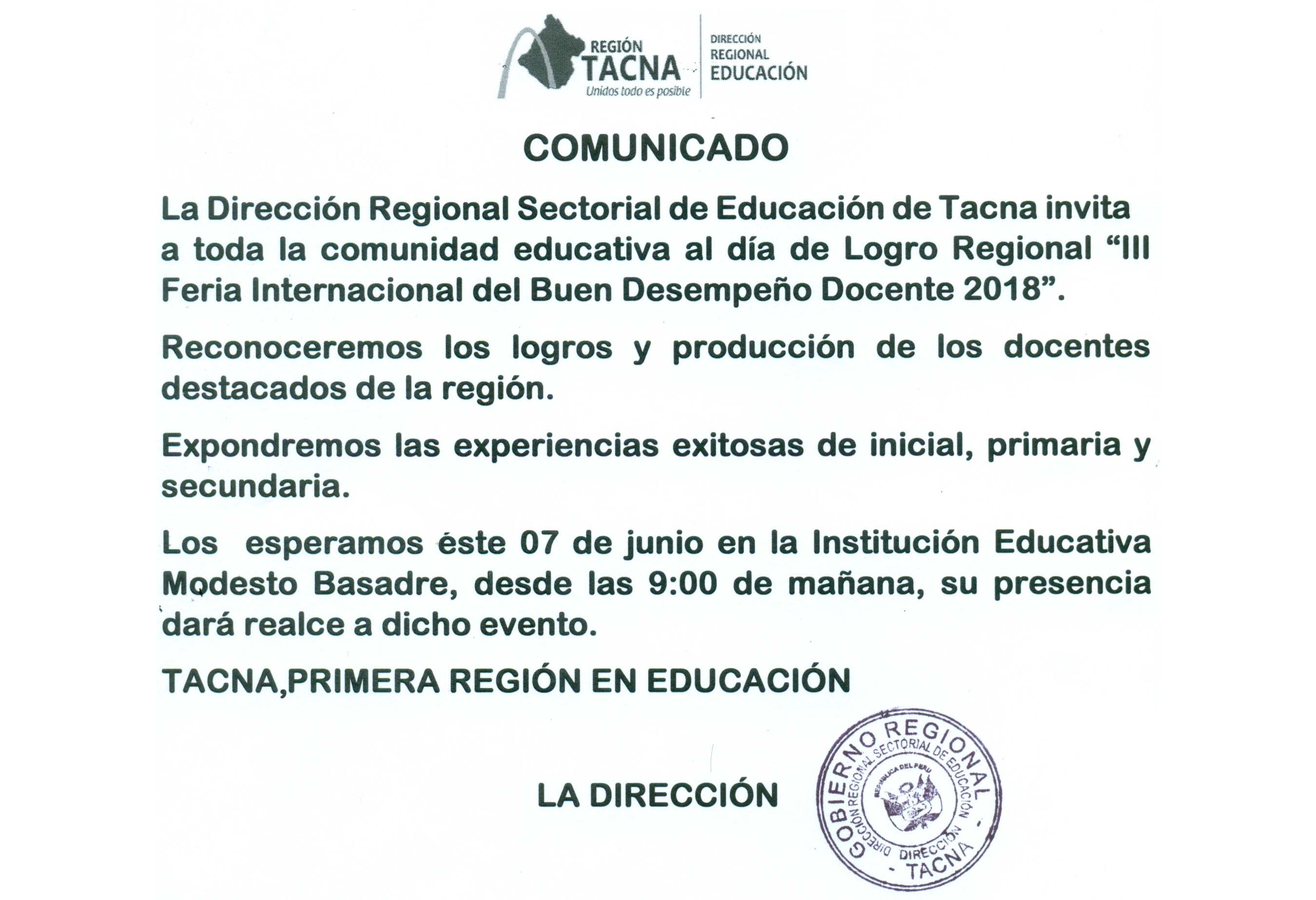 III FERIA INTERNACIONAL DEL BUEN DESEMPEÑO DOCENTE Imagen Institucional 2018-06-04 21:46:29 Descripción: COMUNICADO DRSET