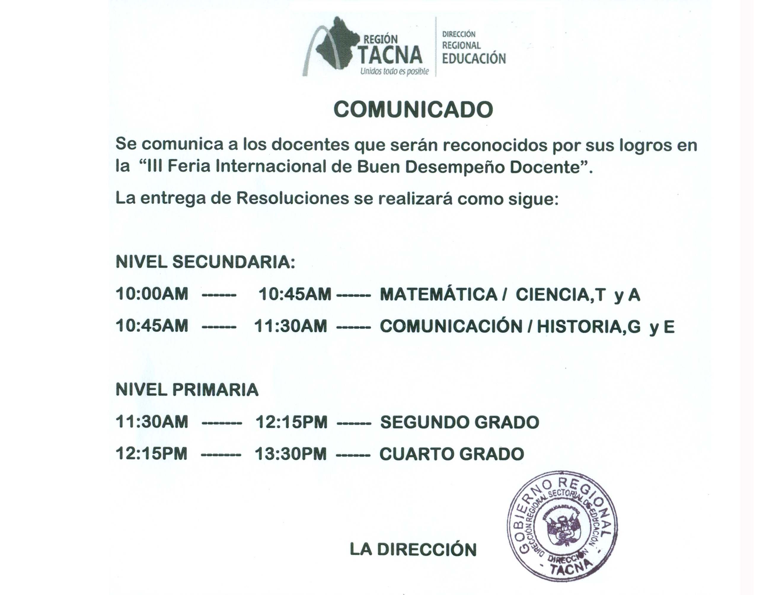 III FERIA INTERNACIONAL DEL BUEN DESEMPEÑO DOCENTE - HORARIO DE ENTREGA DE RESOLUCIONES Imagen Institucional 2018-06-04 21:43:21 Descripción: COMUNICADO DRSET