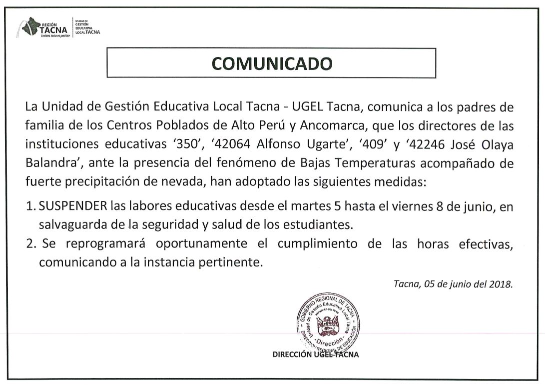 EN CENTROS POBLADOS ALTO PERÚ Y ANCOMARCA SE SUSPENDEN LABORES EDUCATIVAS HASTA EL 08 DE JUNIO Imagen Institucional 2018-06-05 15:34:23 Descripción: COMUNICADO UGEL TACNA Descargar documento