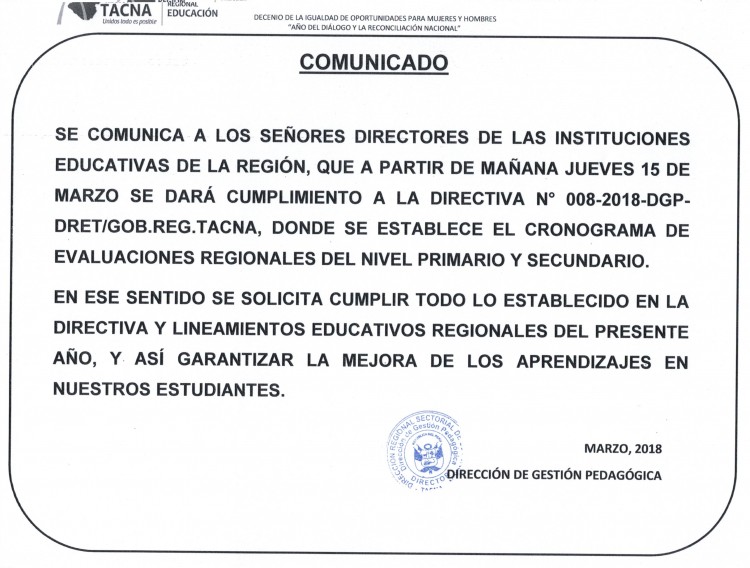 EVALUACIONES REGIONALES PARA ESTUDIANTES DE SEGUNDO DE SECUNDARIA Imagen Institucional 2018-03-23 07:20:58 Descripción: COMUNICADO 039-2018-AGP-UGELT Descargar documento